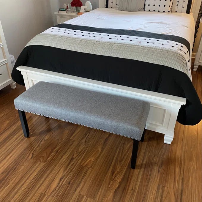 This faux linen bench is perfect in my entryway. It looks upscale with decorative nails and adds great extra seating but can easily move to any room. Quality piece!