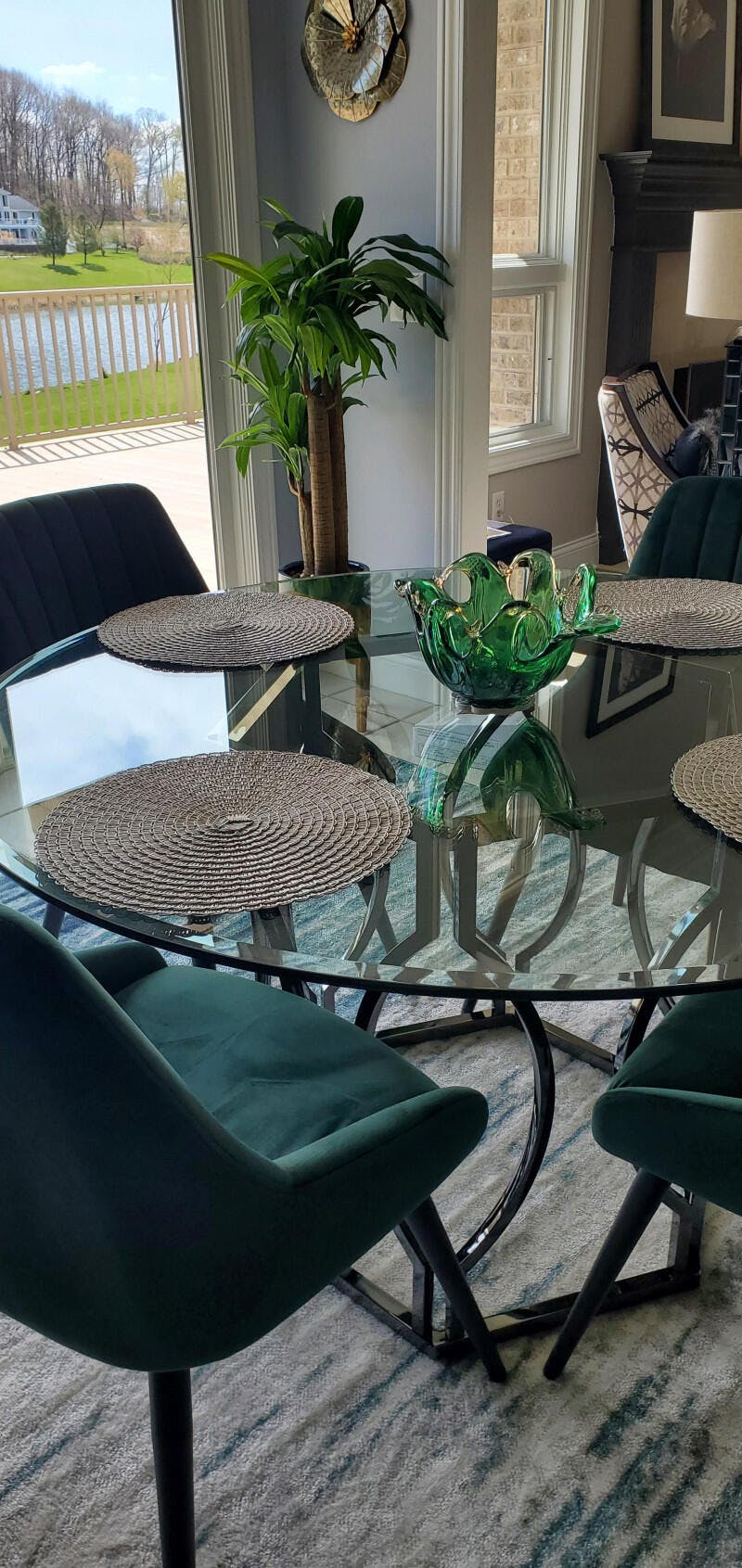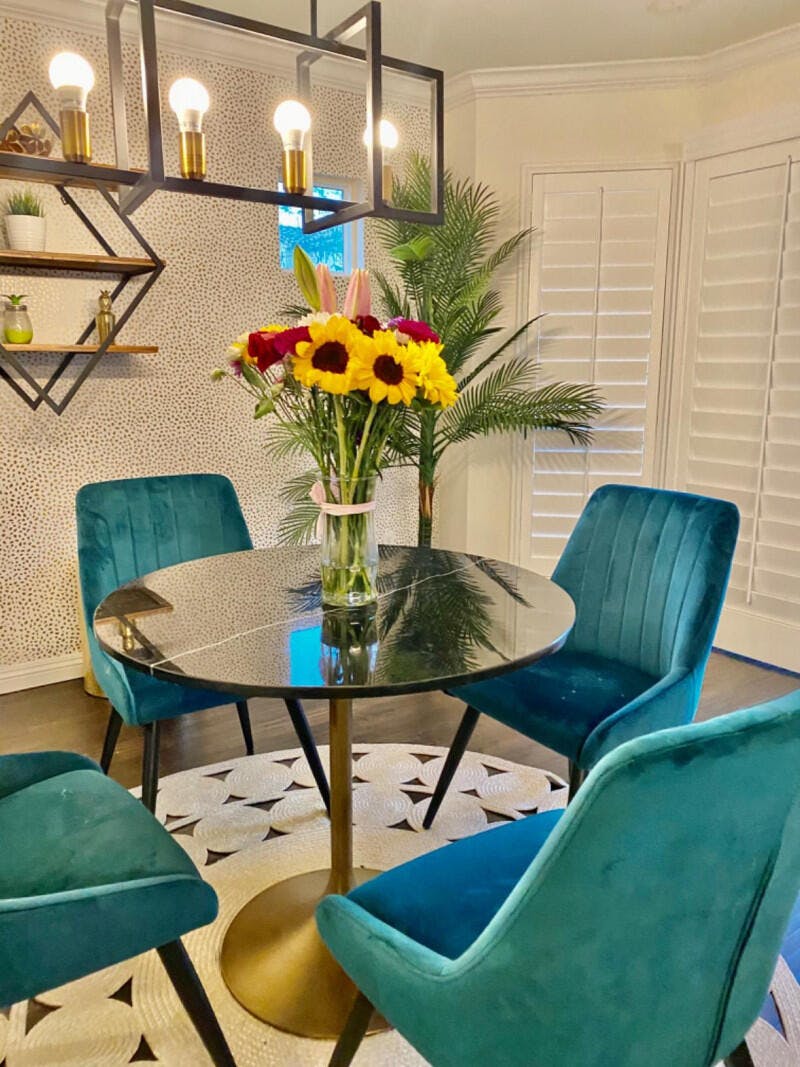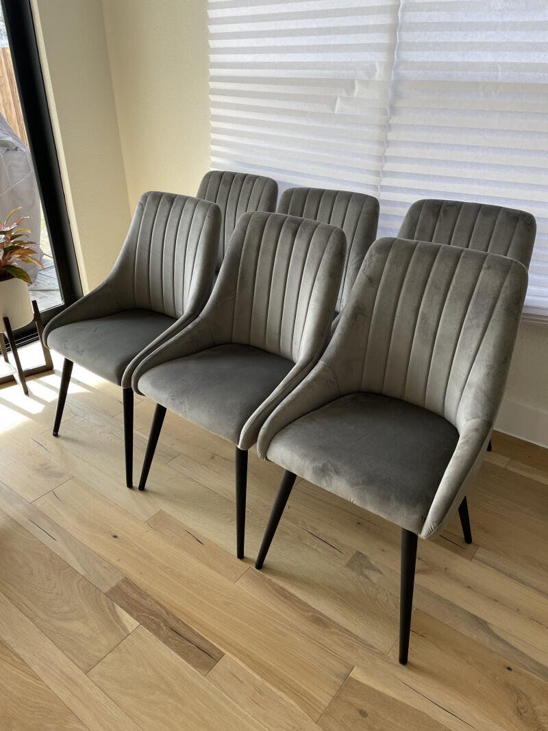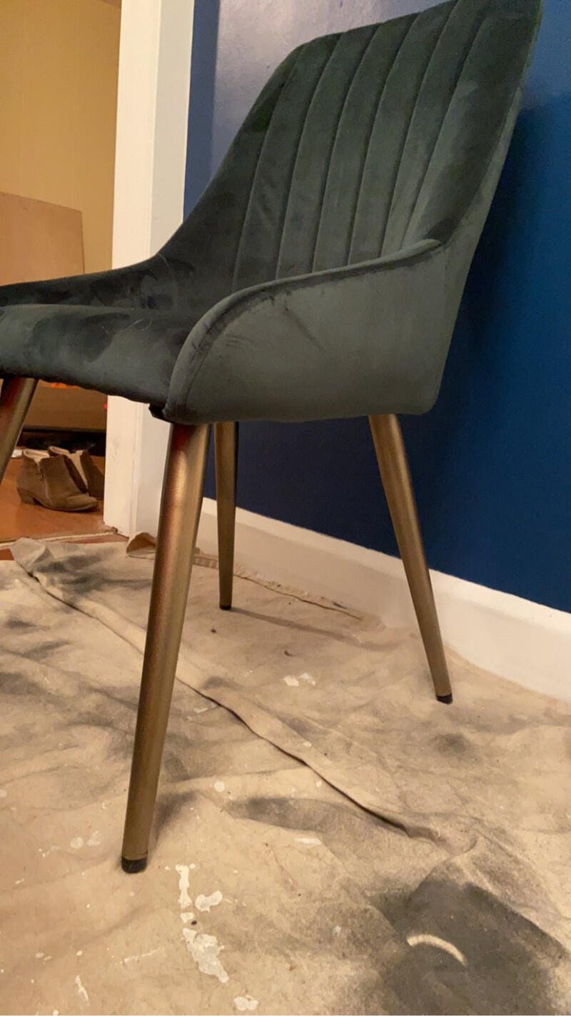 Love love love these velvet dining chairs. Went perfectly with the industrial theme we were going for with our dining room. Took my husband no time at all to assemble them.