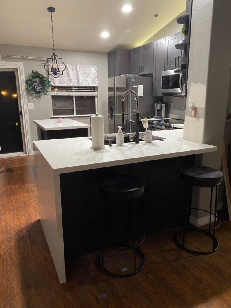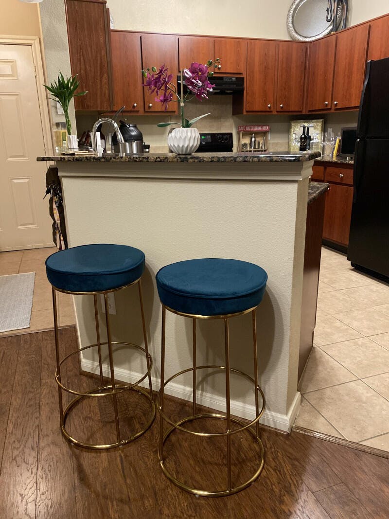 We have a 1200 sq ft apartment, and these barstools fit PERFECTLY!! Theyre not too big, not too small, just right. Theyre the perfect combination of gold and emerald, with extremely plush/comfortable seating. So so happy with this purchase. Assembly was extremely easy, and theyre beautiful :)