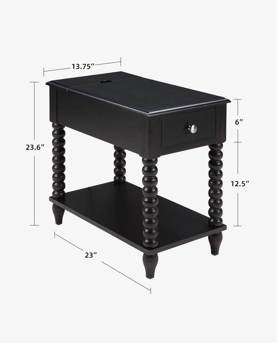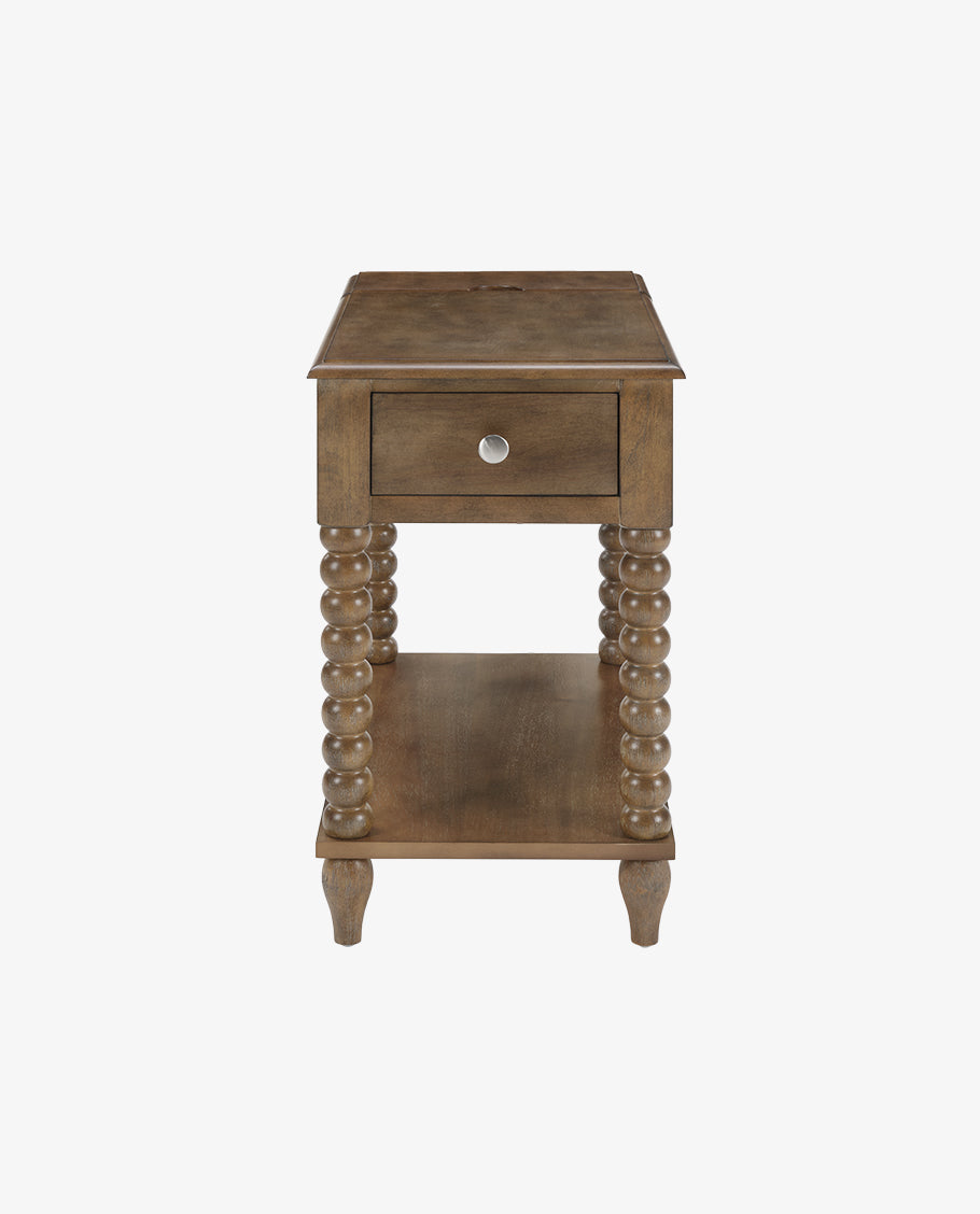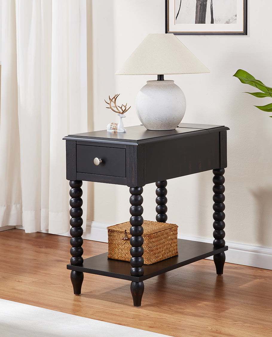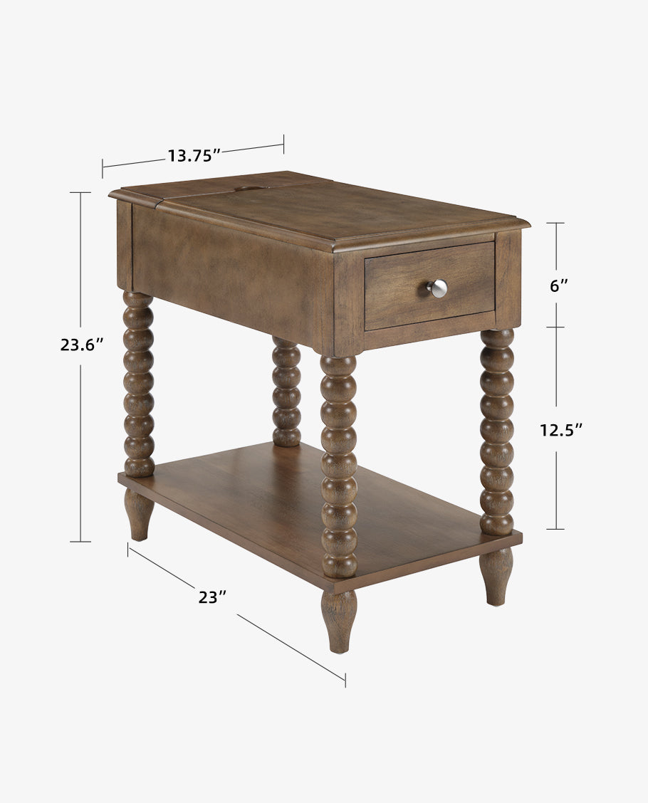This versatile Spindle Leg Wood End Table features a built-in charging station with 2 USB ports, 1 outlet, and 2 Type-C ports embedded in the solid wood side panel. Charge multiple devices like phones and tablets clutter-free. Use as a sofa-side organizer, bedroom station, balcony stand, or hallway console. Supports up to 50lbs for lamps, trays, and more.