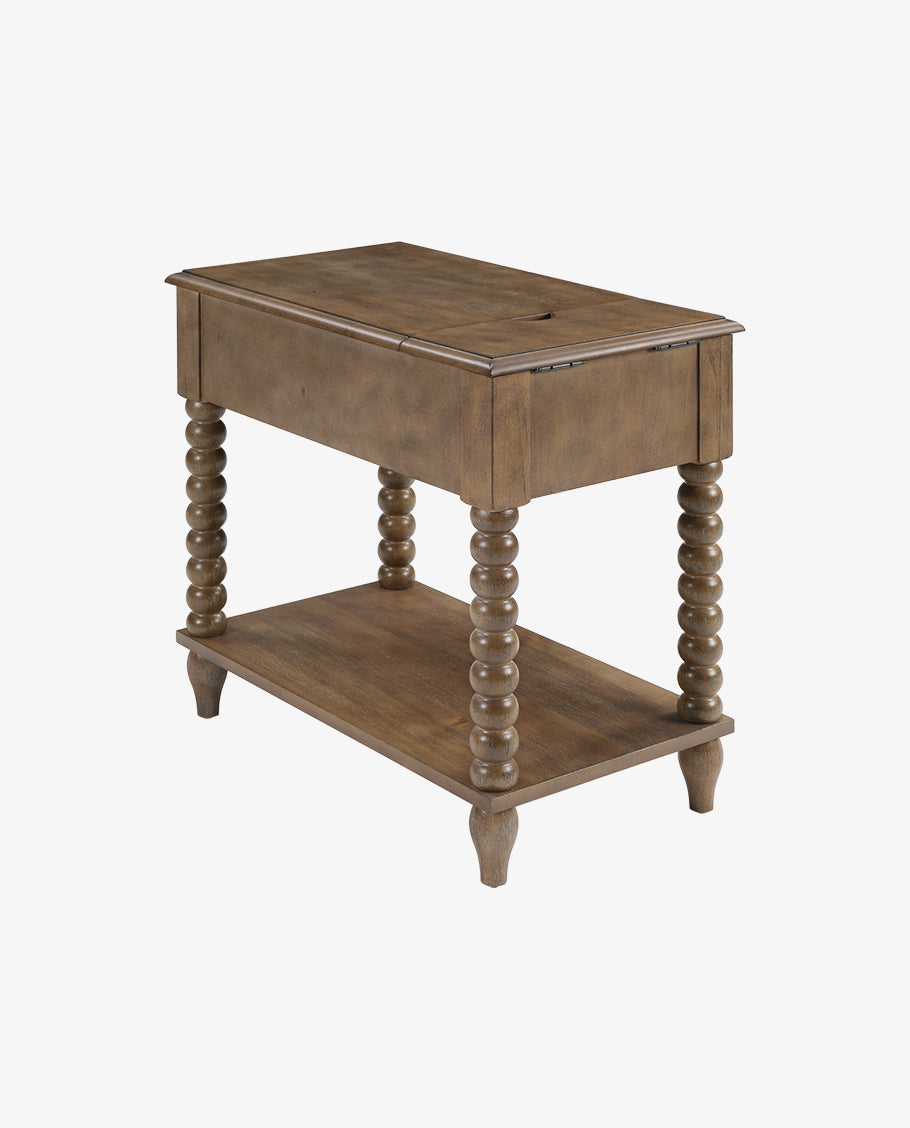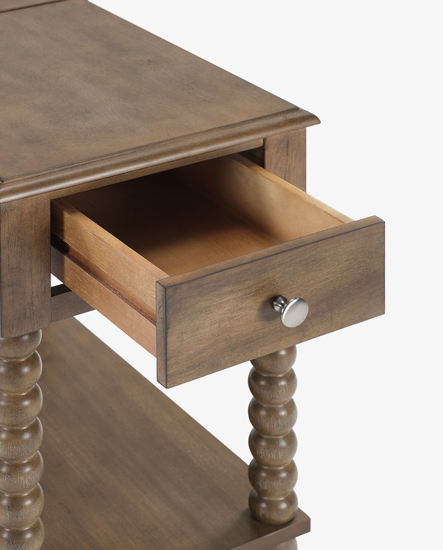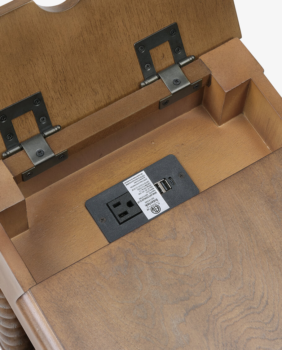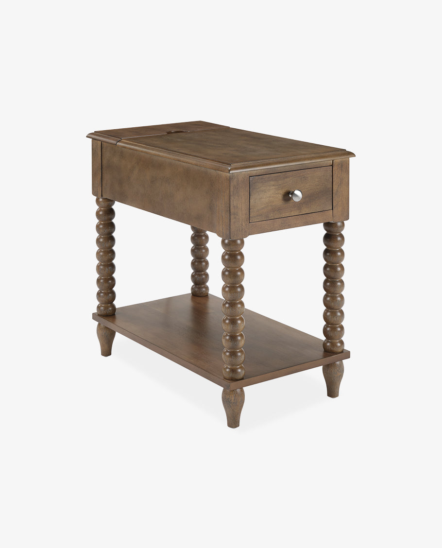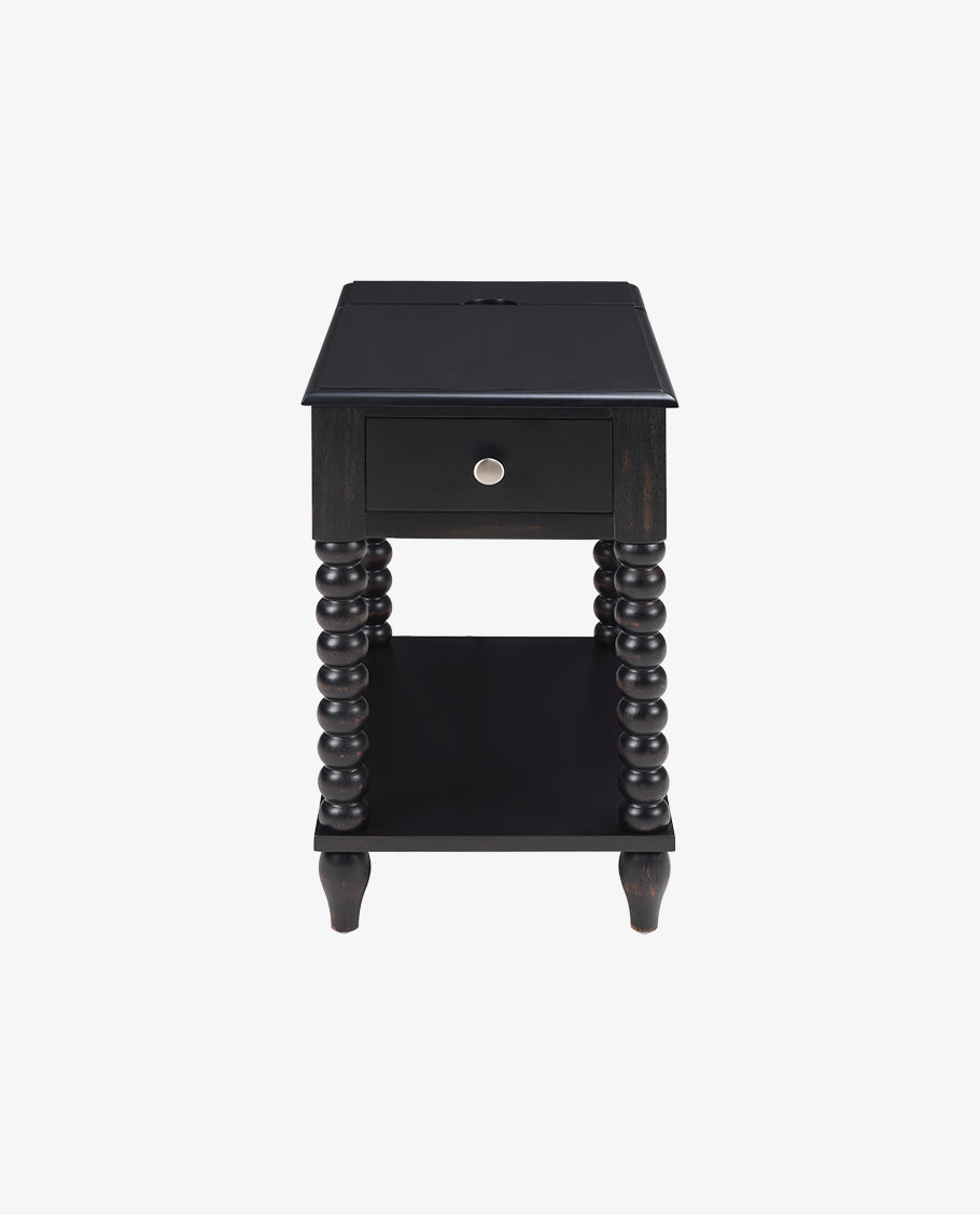 This versatile Spindle Leg Wood End Table features a built-in charging station with 2 USB ports, 1 outlet, and 2 Type-C ports embedded in the solid wood side panel. Charge multiple devices like phones and tablets clutter-free. Use as a sofa-side organizer, bedroom station, balcony stand, or hallway console. Supports up to 50lbs for lamps, trays, and more.